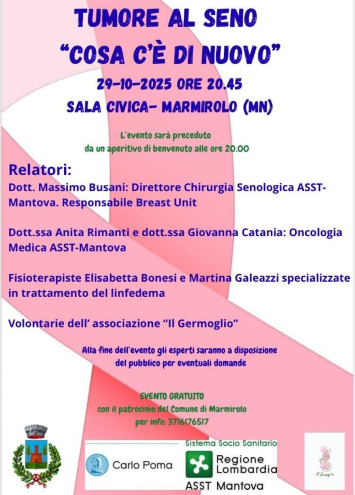 In occasione dell’Ottobre Rosa, mese dedicato all’importanza della diagnosi precoce e della corretta informazione sul tumore al seno, il Comune di Marmirolo, l’Associazione Il Germoglio e l’ASST di Mantova, organizzano un evento informativo gratuito rivolto a tutti i cittadini.
